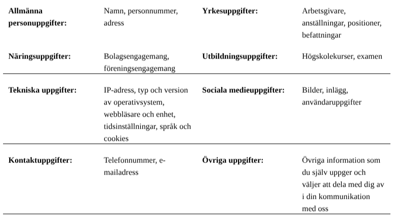 I samband med marknadsföring via sociala medier kan vi komma att samla in dina Allmänna personuppgifter, Kontaktuppgifter och Sociala medieuppgifter.
